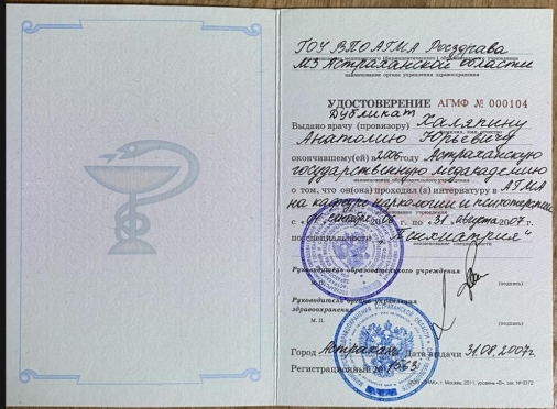 Астраханская государственная медицинская академия Психиатр (2006-2007 гг);