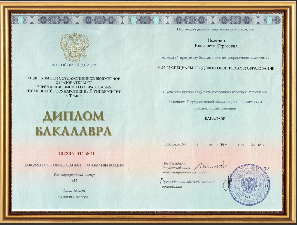 Тюменский государственный университет: Дефектологическое образование (2016 г.);