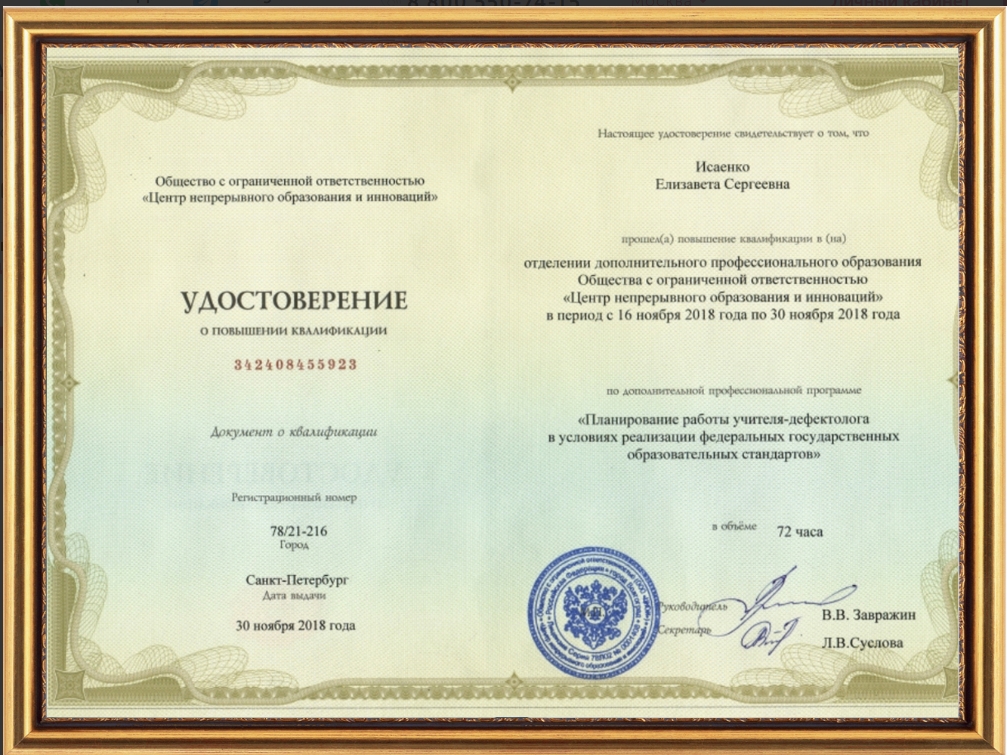 ПК: «Планирование работы учителя — дефектолога в условиях реализации федеральных государственных образовательных стандартов» (2018 г.);